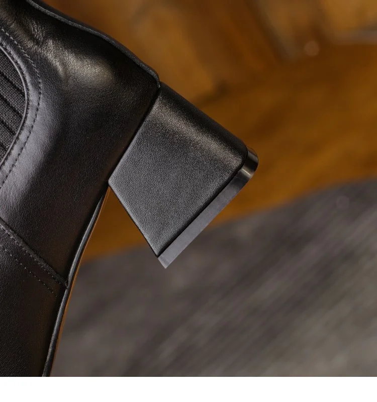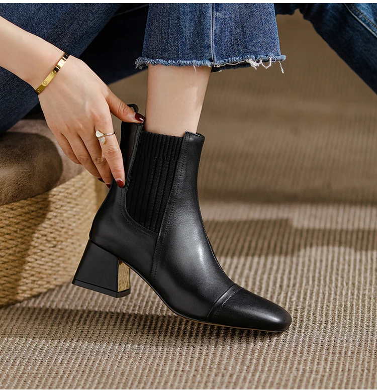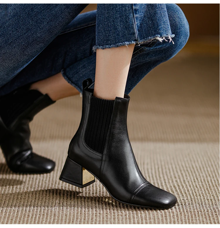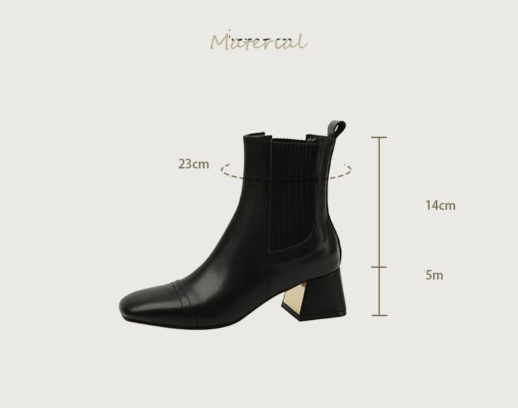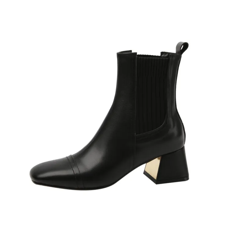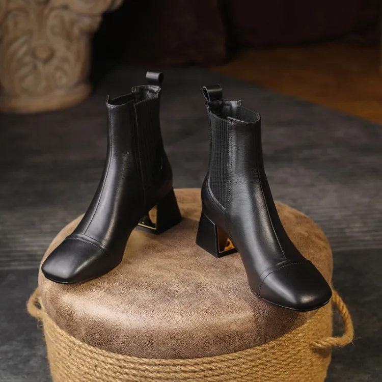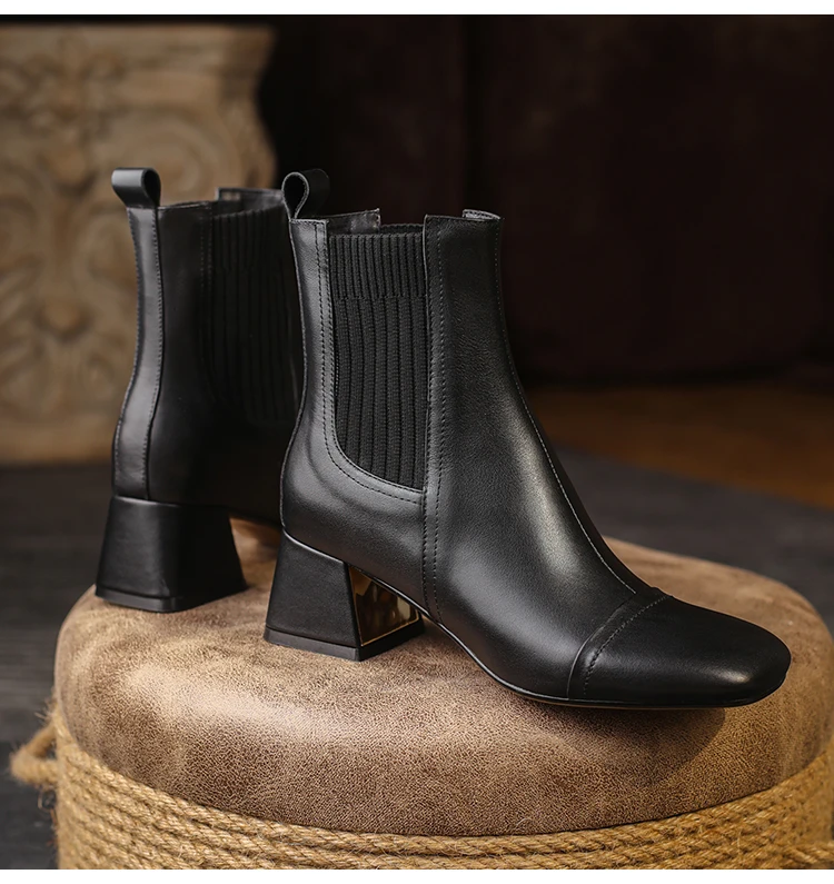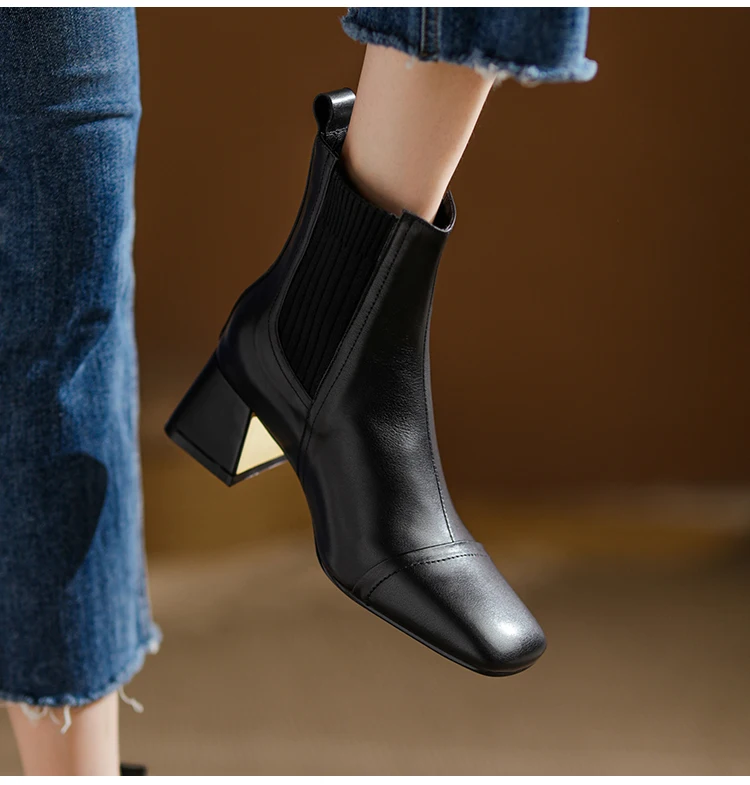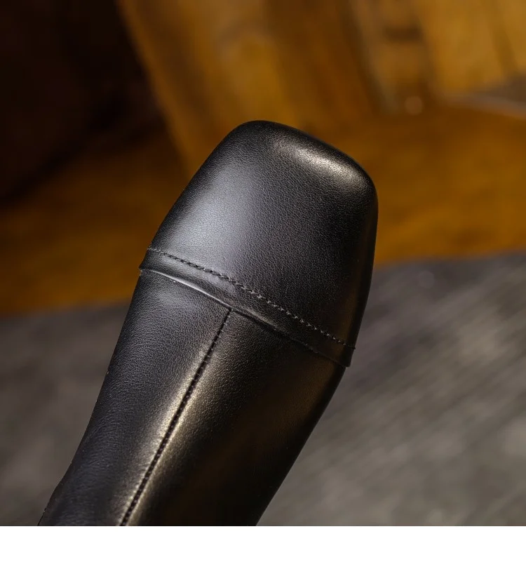 Nuevos zapatos de otoño para mujer 2021 Botas de diseño para mujer Botas de cuero negro Punta cuadrada Tacón grueso Zapatos de mujer Botas de moda para invierno para mujer